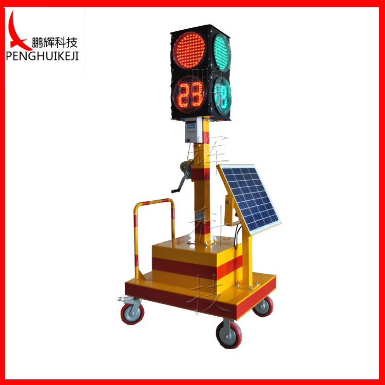 四面滿屏加倒計時信號燈,控制器為數碼管顯示,上顯示紅、黃、綠三色同屏顯示,下顯示紅綠兩色倒計時。配有可移動小車,用于應對緊急停電及其它情況的需要。可手動升降1.8米至2.5米,內含蓄電池,無需另接電源。配太陽能或交流220V充電,可在陰雨天下連續工作10天。